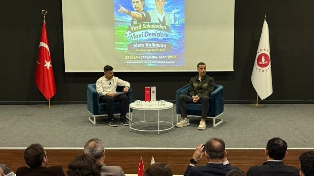 Söyleşide eski hakem, mühendis ve iş insanı Mete Kalkavan, öğrencilerle bir araya gelerek yeşil sahalardan iş dünyasına ve denizcilik sektörüne uzanan kariyer yolculuğunu anlattı.