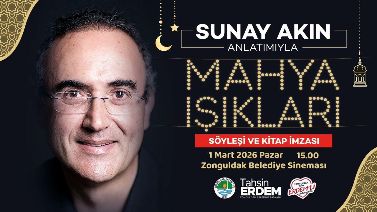 “Sunay Akın Anlatımıyla Mahya Işıkları” başlıklı söyleşi programı ve kitap imza etkinliği, 1 Mart 2026 Pazar günü saat 15.00’te Zonguldak Belediye Sineması’nda gerçekleştirilecek.