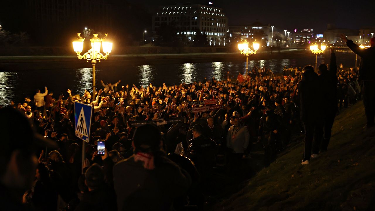 Üsküp kentindeki meydanda bir araya gelen kırmızı-beyazlı taraftarlar, burada sloganlar atarak stadyuma geçti.