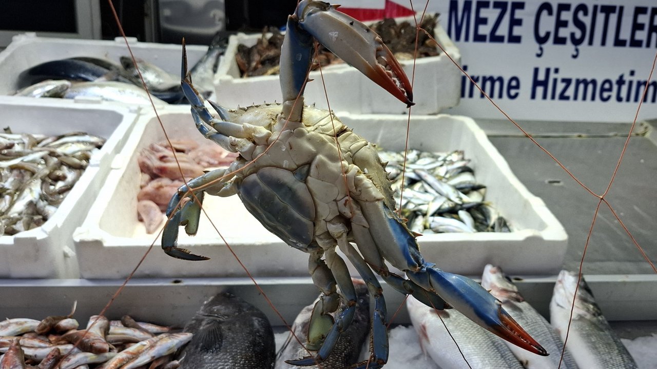 Mavi rengi ve farklı görüntüsüyle dikkati çeken yengeç, kentteki bir balıkçı tezgahında satışa sunuldu.