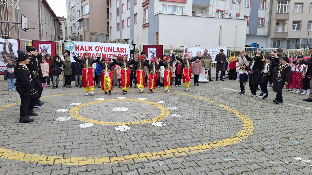 Cumhuriyet İlkokulu bahçesinde düzenlenen yarışmada, öğrenciler oluşturdukları gruplarla Sinop, Artvin ve Silifke yörelerine ait halk oyunları gösterileri sundu.