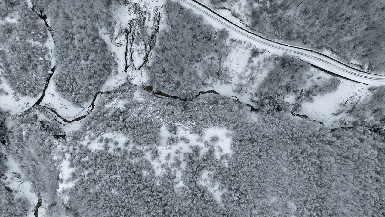 Kar yağışının ardından seyrine doyumsuz manzaranın oluştuğu ormanlar, dronla görüntülendi.