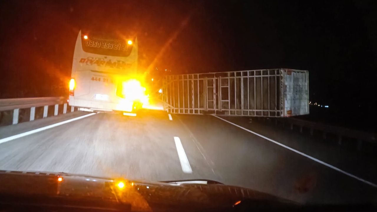 M.Y. idaresindeki 57 AAR 045 plakalı tır, Sinop-Samsun kara yolunda rüzgarın etkisiyle devrildi.