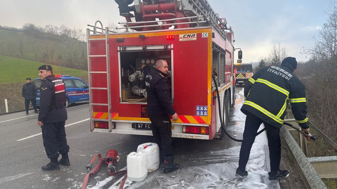 Sinop-Boyabat kara yolunda ilerleyen 55 AIU 085 plakalı kamyonun lastiklerinden duman çıktığını fark eden sürücü İ.Ş, aracını yol kenarına park etti.