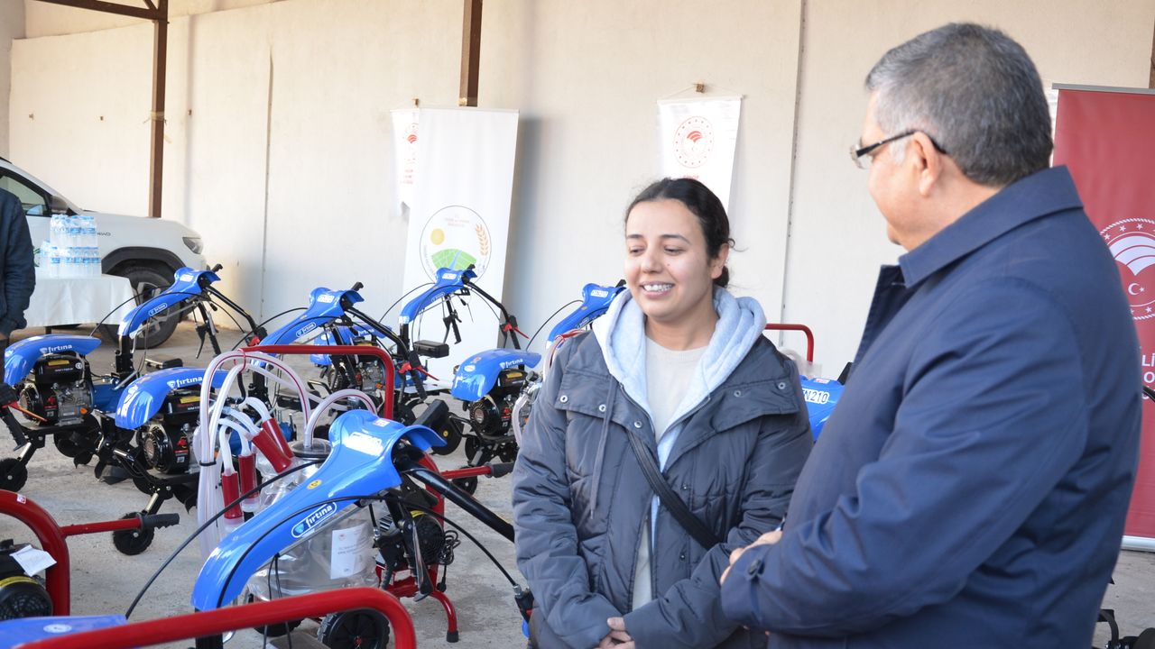 Proje çerçevesinde, alımı yapılan yüzde 100 hibeli 17 çapa ile 13 süt sağım makinesi düzenlenen törenle üreticilere dağıtıldı.
