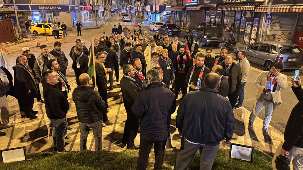 Mavi Marmara Gemisi'nde bulunan eski AK Parti Düzce Milletvekili İbrahim Korkmaz'ın da katıldığı eylemde, vatandaşlar ellerinde Filistin bayrakları ve pankartlarla İsrail'in Sumud Filosu'na yönelik saldırısına tepki gösterdi.