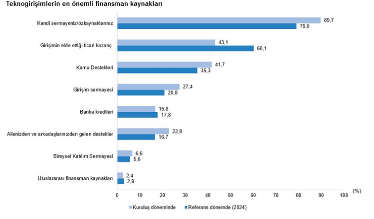 Araştırmaya göre teknogirişimlerin en önemli finansman kaynağı özkaynaklar oldu. Kuruluş aşamasında bu oran yüzde 89,7 iken, 2024'te yüzde 79,0 olarak gerçekleşti. Girişimlerin yüzde 54,4'ü yeni finansman arayışına girerken, büyük kısmı gelen yatırım tekliflerini yetersiz buldu.