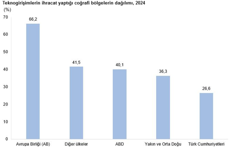 Dijitalleşme tarafında, teknogirişimlerin yüzde 22,2'si e-satış yaptı. Yurt dışı e-satışlarda ve ihracatta Avrupa Birliği ilk sırada yer aldı. Ar-Ge faaliyeti yürüten girişimlerin ihracat oranı (yüzde 25,6), Ar-Ge yapmayanların yaklaşık iki katı oldu.