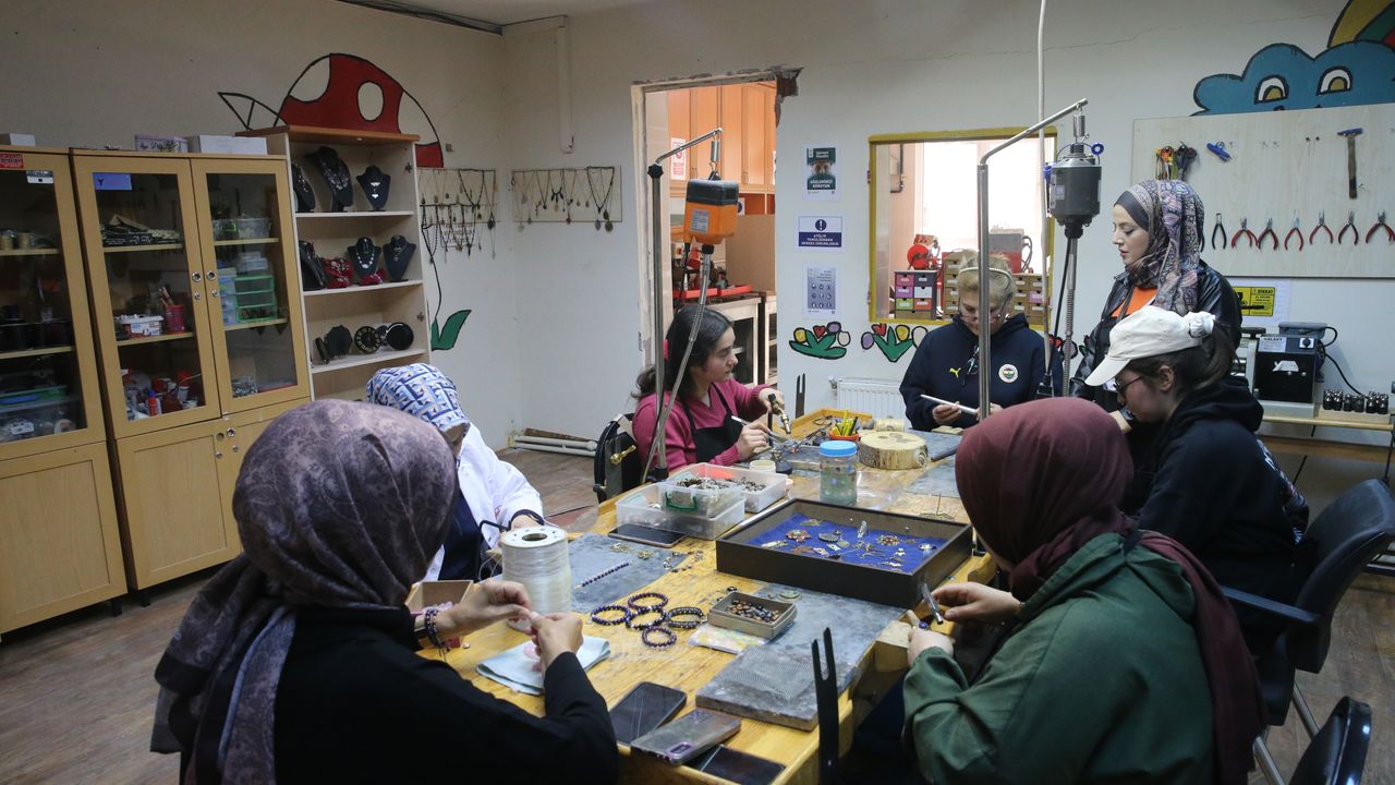 Zile Halk Eğitimi Merkezi'nde açılan kursa katılan 10 kadın, doğada bulunan yarı değerli taşlardan kolye, tespih, yüzük, küpe ve anahtarlık gibi hediyelik eşyalar yapıyor.