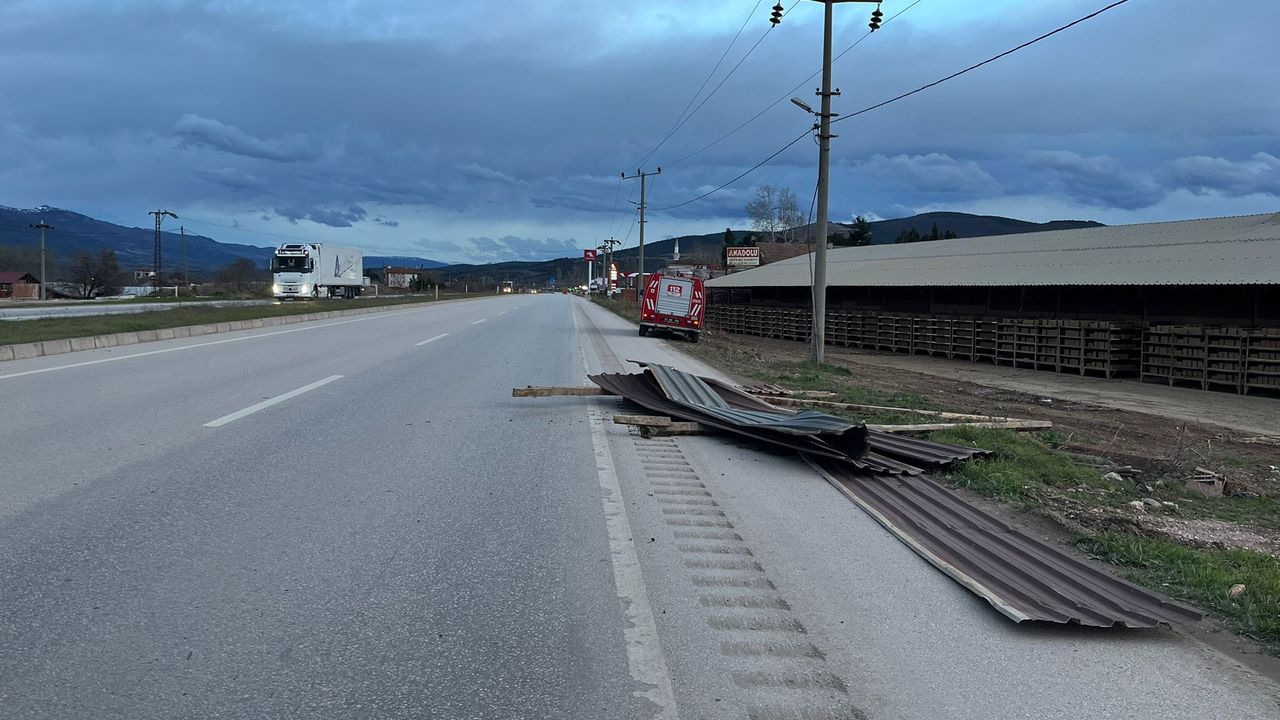 Emniyet ekiplerince yolda güvenlik önlemi alınırken, çatı parçalarının temizlenmesi sonucu trafik akışı normale döndü.