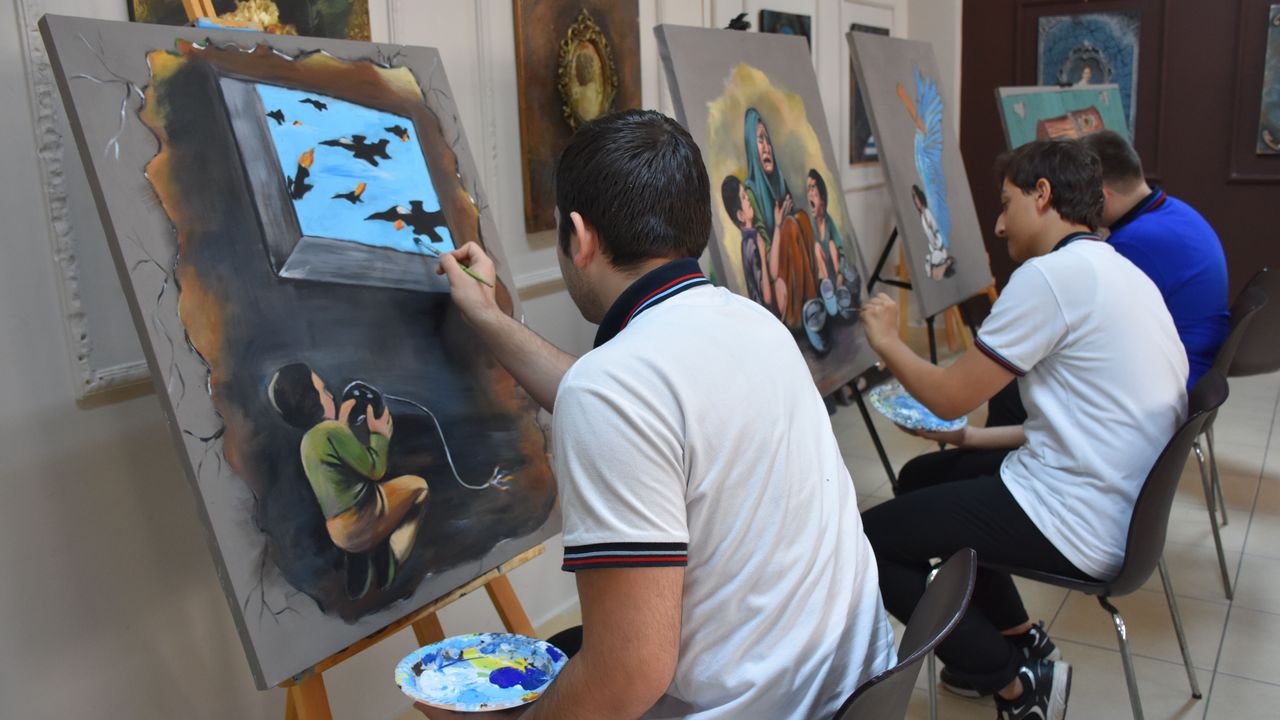 Görsel Sanatlar Öğretmeni Esra Bingöl gözetiminde resim yeteneğine sahip 24 öğrenci, yaklaşık 4 aydır Filistin, Ukrayna ve Sincan Uygur Özerk Bölgesi'nde yaşananları tuvale yansıtıyor.