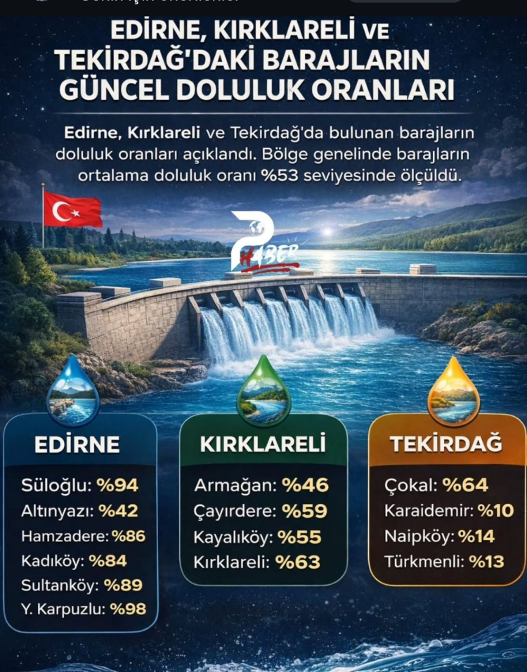 Son yağışlarla birlikte Trakya'daki barajların doluluk oranları belli oldu. Edirne'deki Süloğlu yüzde 94 ve Y.Karpuzlu yüzde 98 ile zirvede olurken, Tekirdağ'da Naipköy'ün doluluk oranı yüzde 14) ve Karaidemir'in ise yüzde 10 oranında kritik seviyede olduğu gözlendi. Bölge ortalaması ise yüzde 53.