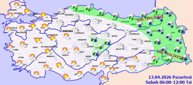 Meteoroloji Genel Müdürlüğü'nün son değerlendirmelerine göre, ülkemizin kuzey, iç ve doğu kesimleri parçalı ve çok bulutlu olacak. İç Anadolu'nun kuzeydoğusu, Batı Karadeniz'in doğusu, Orta ve Doğu Karadeniz, Doğu Anadolu'nun kuzey ve doğusu ile Mardin, Batman ve Siirt çevrelerinde aralıklı yağış bekleniyor.