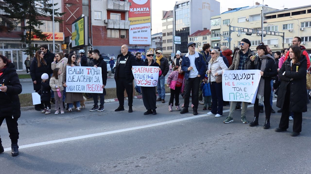 Buradan Meclis binasına ve Çevre ve Fiziksel Planlama Bakanlığına yürüyen göstericiler, 'Hava lüks değil, bir haktır', 'Usje'ye dur' ve 'Onlar için kar, bizim için hastalık' yazılı pankartlar taşıdı.
