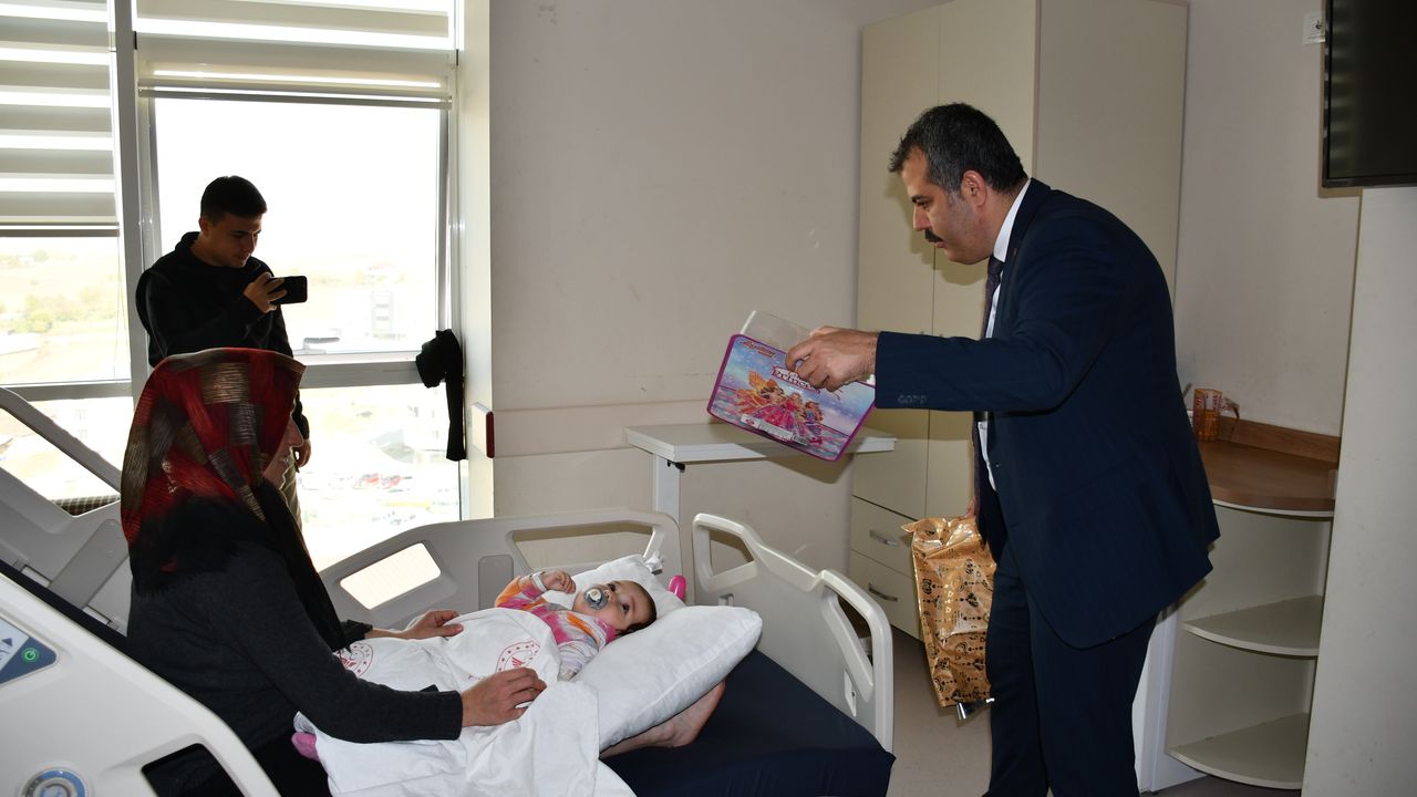 Kaymakam Özgür Kaya, çocuk servisinde tedavi gören hastaları ziyaret ederek sağlık durumları hakkında bilgi aldı ve onlara hediyeler verdi.