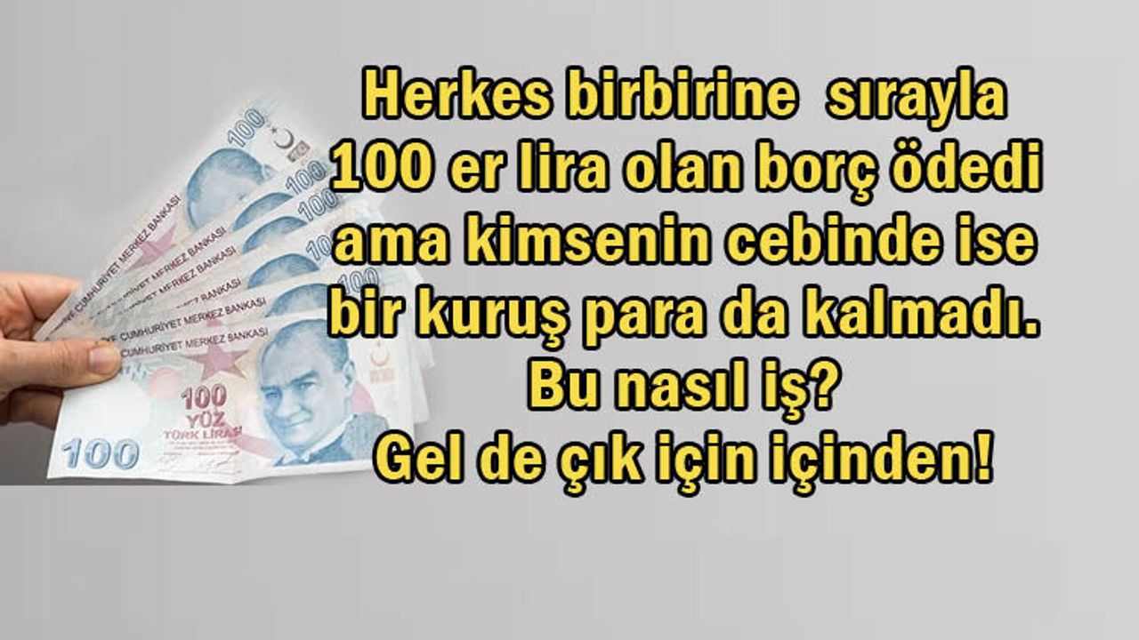 Kasap aldığı bu parayı, “ya benim de manava borcum var” diyerek, yavaş yavaş gezmeye başlayan 100 lirayı manava gönderiyor. Borç biter mi. Kimin borcu yok ki? Manav efendi de, taksiciye olan borcunu hatırlayıp, elde ele geçmeyi alışmış aynı 100 lirayı taksiciye yolluyor.