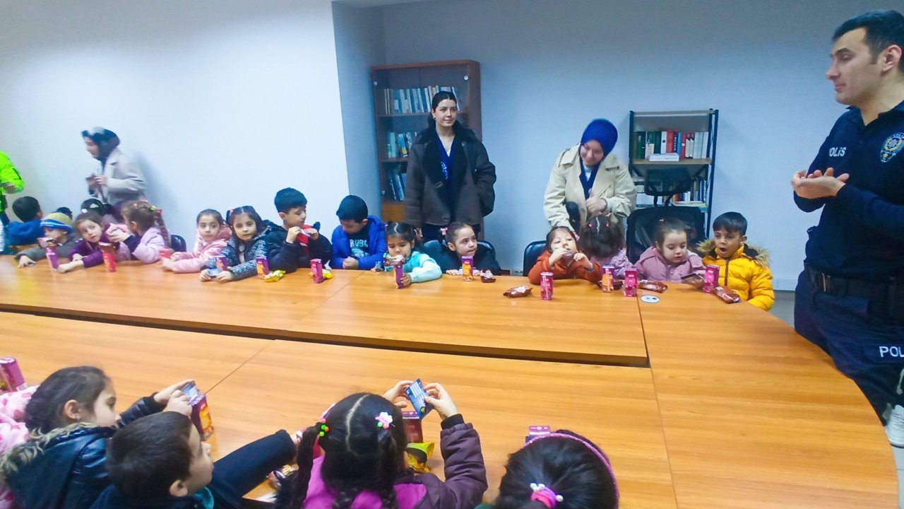 Öğrenciler, daha sonra İlçe Emniyet Amirliğinde İlçe Emniyet Amiri Komiser Fatih Yaşar tarafından karşılandı. Minik öğrenciler, Yaşar'a hediyelerini verdi.