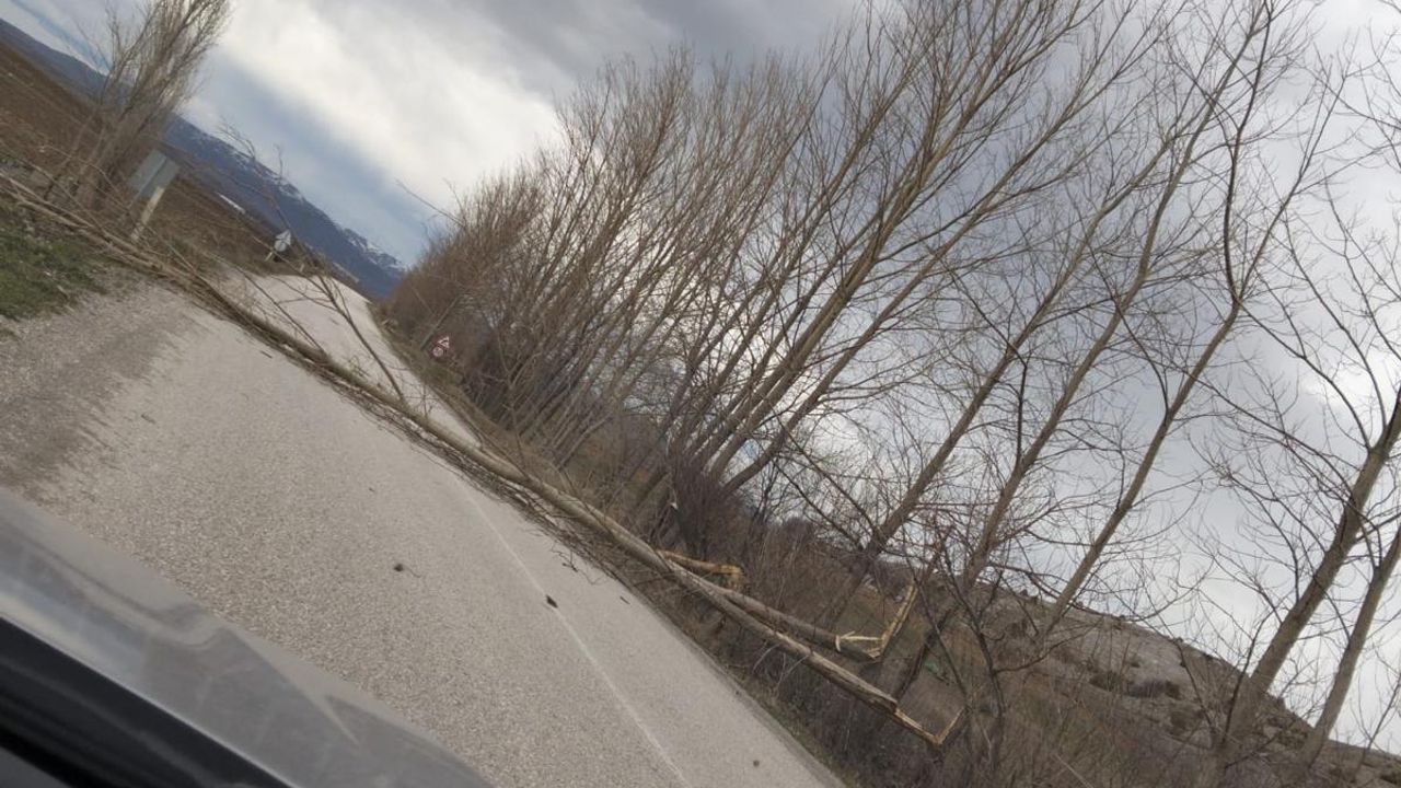 Şiddetli rüzgar nedeniyle Yeşilyurt-Çamlıbel kara yolunda Çubuklu köyü yakınlarında yola devrilen ağaçlar, trafiğin aksamasına yol açtı.