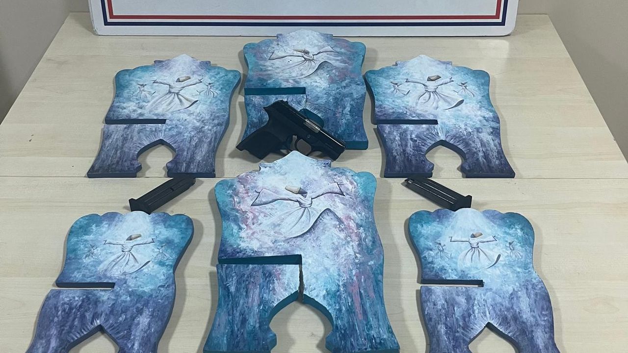 Şüphelinin ikametinde yapılan aramalarda, preslenerek gizlemek amaçlı semazen figürüyle boyanmış rahle içinde 7 kilo 350 gram sentetik uyuşturucu, tabanca ve 11 mermi ele geçirildi.